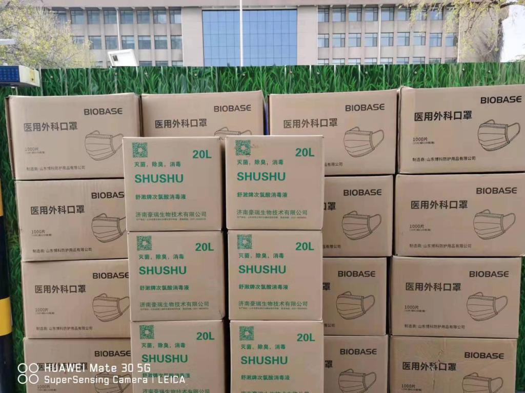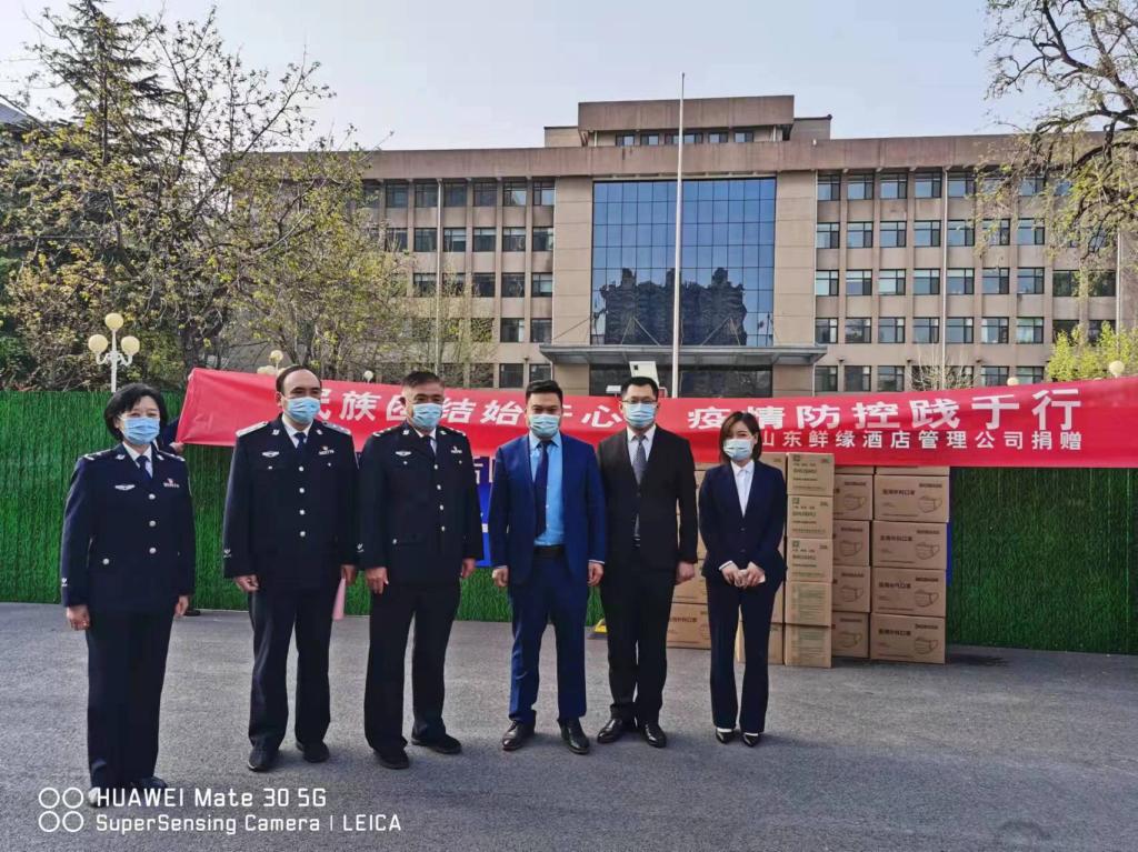 山东鲜缘酒店管理公司本次捐赠的防疫物资包括2万个医用外科口罩、消毒液200升。