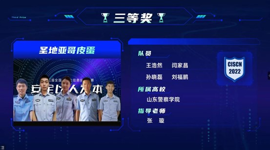 8月23日-24日,由教育部高等学校网络空间安全专业教学指导委员会发起并主办、中央网信办支持,南开大学承办的第十五届全国大学生信息安全竞赛—创新实践能力赛成功举办。由我校警务信息系张璇老师指导,网安社成员王浩然、闫家昌、孙晓磊、刘福鹏组成的战队参加竞赛并获得三等奖。