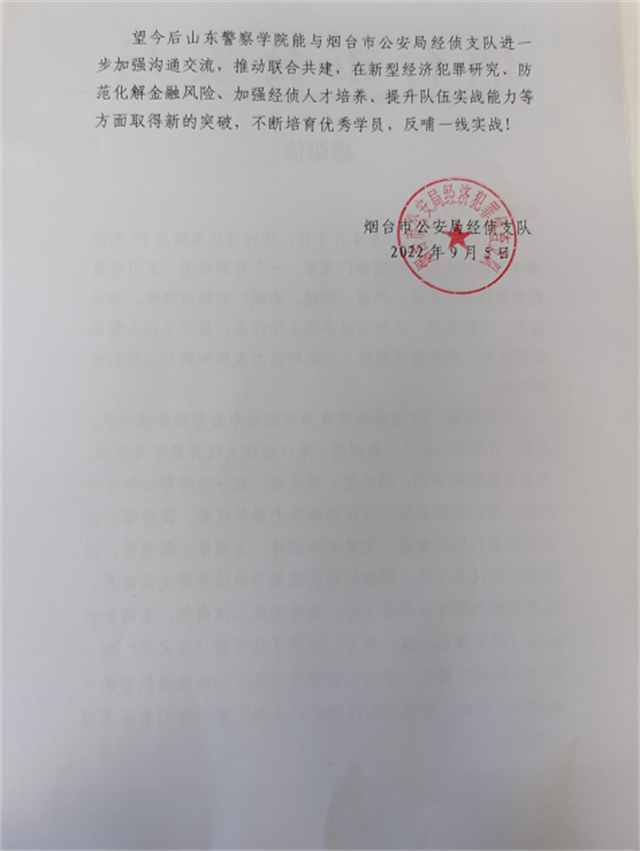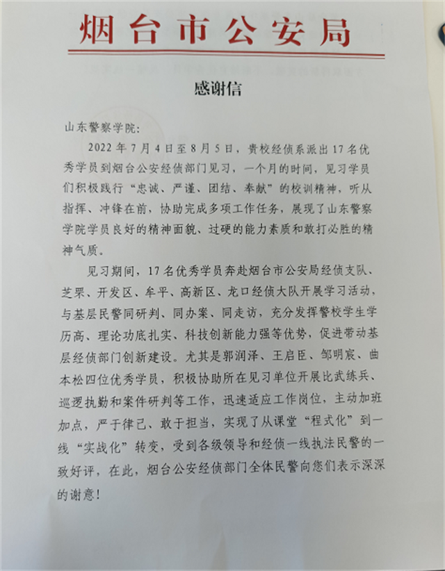 烟台市公安局经侦支队在感谢信中说,经侦系17名学生见习期间,听从指挥、冲锋在前,与基层民警同研判、同办案、同走访,运用所学专业知识,促进带动了基层经侦部门创新建设。尤其是郭润泽等同学,积极协助开展比武练兵、巡逻执勤、案件研判等工作,主动加班加点,严于律己、敢于担当,实现了从课堂“程式化”到一线“实战化”转变,受到领导和经侦一线民警的好评。