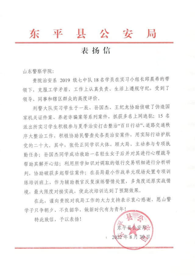 东平县公安局在表扬信中说,治安系2019级七中队18名实习学生克服工学矛盾,生活遵规守纪,工作认真负责,受到了领导、同事和辖区群众的高度评价。其中,于一辰等同学协助侦破伪造国家机关证件案、养老诈骗案,抓获了多名网上逃犯。15名在派出所实习的学生积极参与夏季治安打击整治“百日行动”、道路交通秩序大整治工作,以实际行动为党的二十大胜利召开保驾护航。张伦正同学识大体、顾大局,积极参与专项执勤任务。孙国杰同学成功救助轻生女子,协助破获多起帮信案件,担任最小作战单元现场处置专项训练辅助教官,圆满完成培训任务。