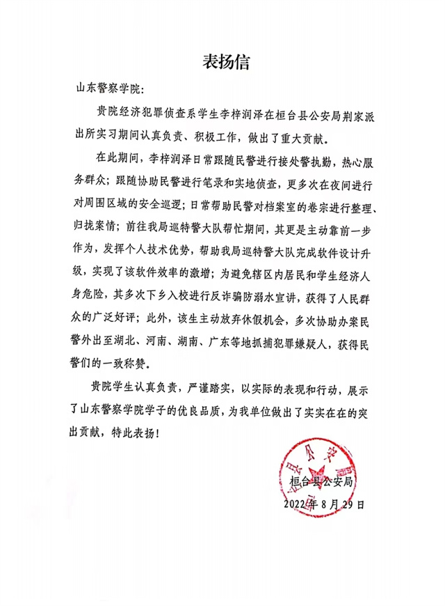 桓台县公安局在表扬信中说,经侦系学生李梓润泽在实习期间靠前一步、主动作为,发挥个人专业优势,帮助特巡警大队实现软件设计升级,极大提升了办案效率。多次进乡村入校园开展反诈骗、防溺水安全知识宣讲,获得了当地群众、师生的广泛好评。主动放弃休假机会,多次协助办案民警到湖北、河南、湖南等地抓捕犯罪嫌疑人,获得民警的一致称赞。