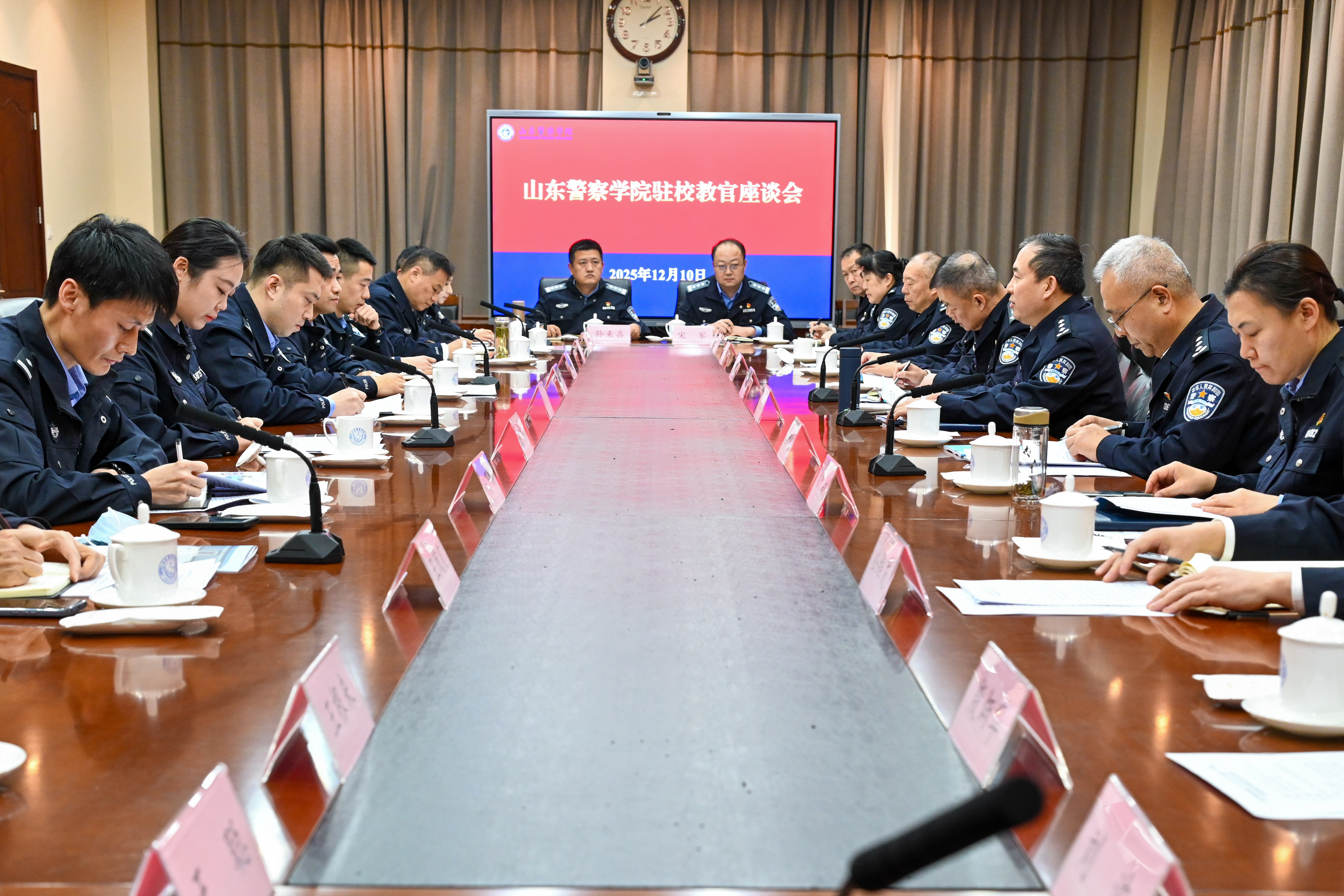 为深入贯彻公安部、教育部《关于加快推进公安高等教育高质量发展的意见》精神,持续推进学校实战化教育教学改革,提升人才培养质量,12月10日,学校在明水校区召开2025-2026学年第一学期驻校教官座谈会。学校党委书记刘福宏,党委副书记、院长毕可志,党委委员、副院长李亦农,省公安厅教育训练处副处长朱敏出席会议。会议由学校党委书记刘福宏主持。