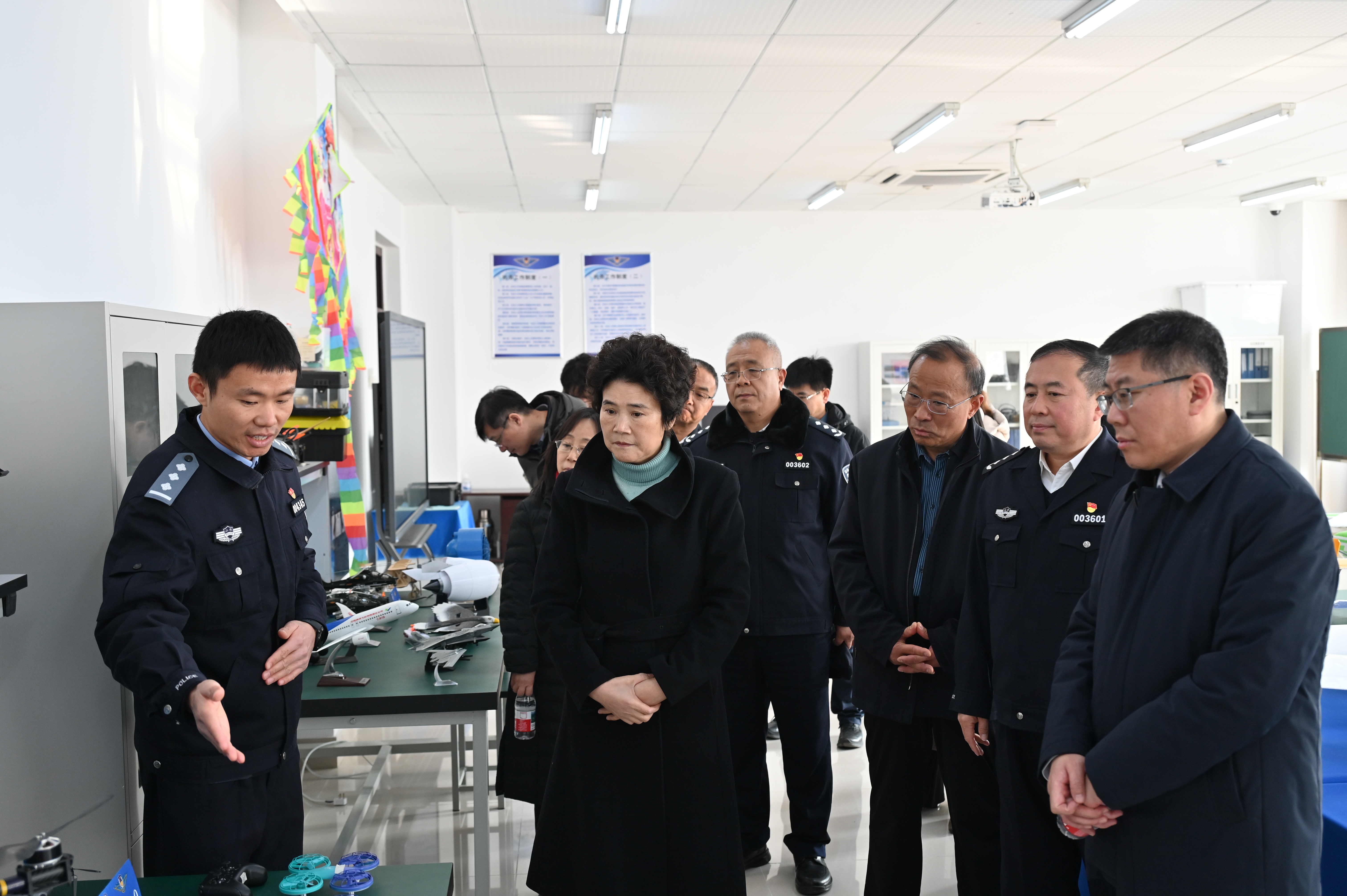 在实验中心,李宁一行先后考察了模拟审讯实验室、智慧交通管控实验室和警用无人机实验室,听取了相关教学科研与实战应用情况的汇报。在信息图书综合楼,全体党员干部观看了学校宣传片,并参观了“全省打击破坏森林和野生动植物资源犯罪教研科普实训基地”,深入了解学校在相关领域的教学实训、科研创新与成果转化情况。