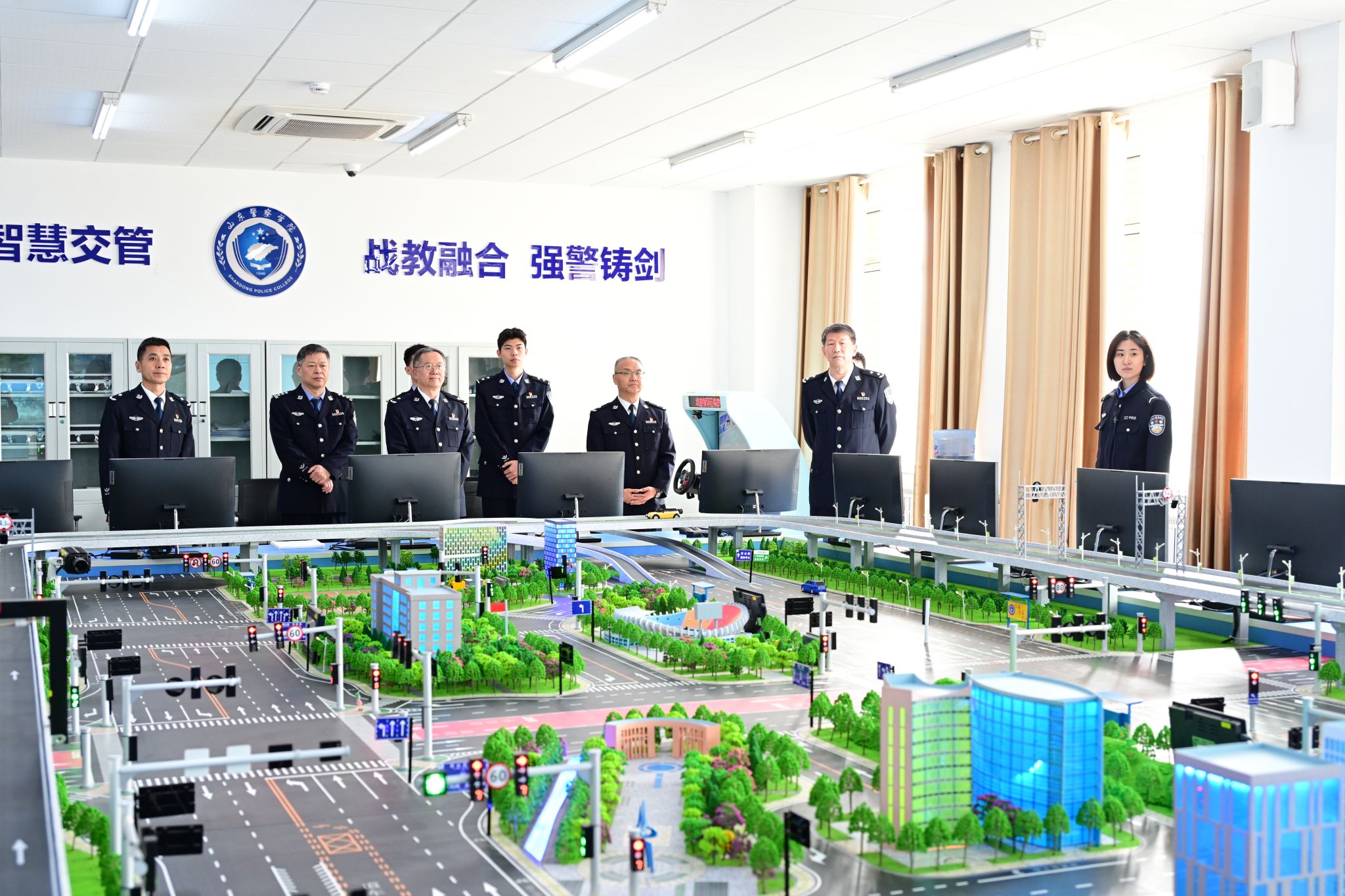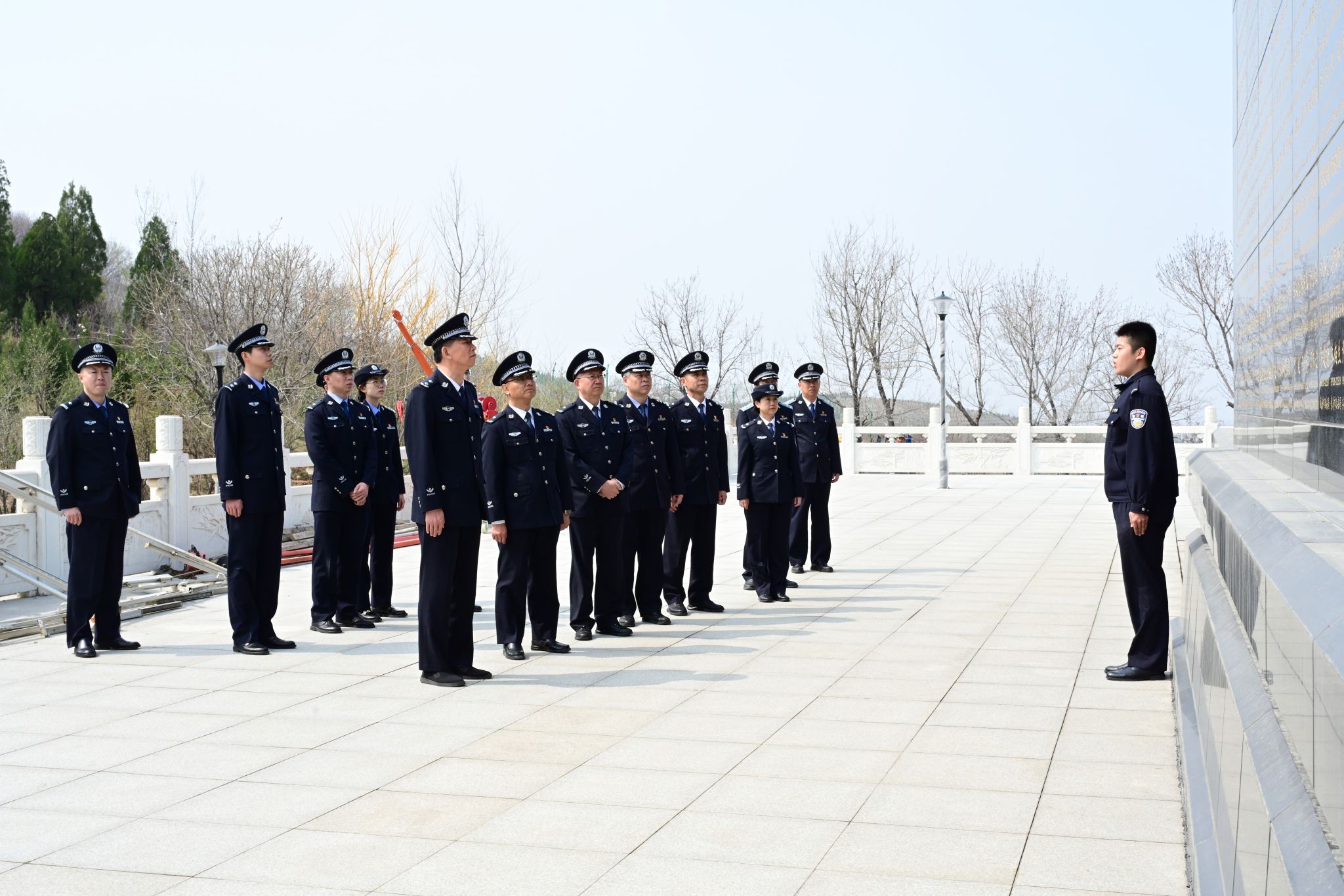 在信息图书综合楼,党员干部们观看了学校宣传片,实地参观全省打击破坏森林和野生动植物资源犯罪教研科普实训基地,详细了解学校在相关领域的教学实训、科研创新及成果转化成效。在实验中心,党员干部们参观了模拟审讯实验室、智慧交通管控实验室、警用无人机实验室,认真听取各平台教学科研建设与实战应用情况介绍。在山东省人民公安英烈纪念园,全体人员依次瞻仰英烈墙、敬献鲜花,深情缅怀公安英烈,传承弘扬英烈精神。