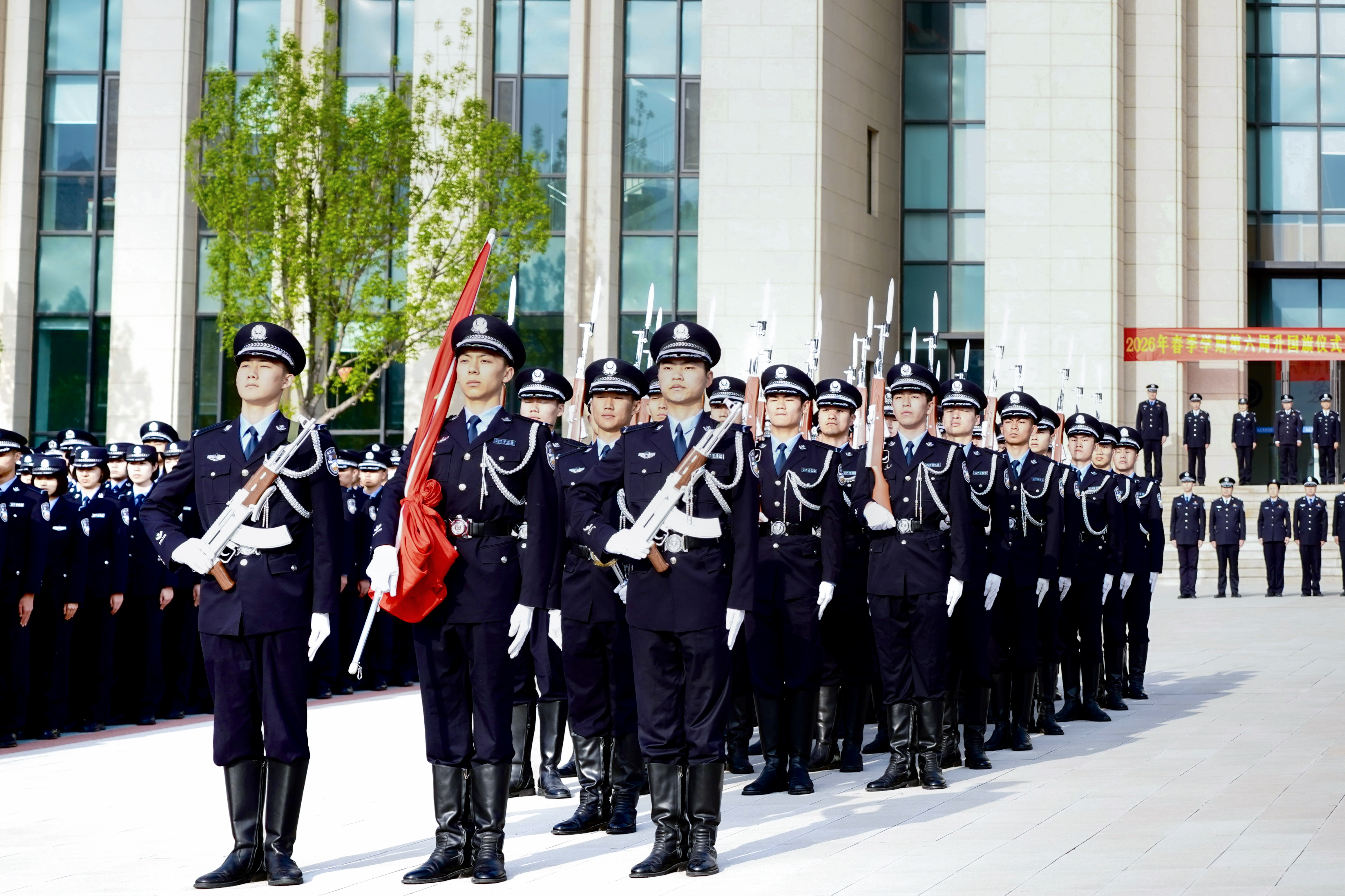 上午8时,升国旗仪式正式开始。全体师生庄严肃立,向国旗敬礼,齐声高唱国歌。根据2026年3月份学生警务化管理检查评比结果,经济犯罪侦查学院学生支队荣获第一名,刘福宏为其颁授警务化管理“流动红旗”。