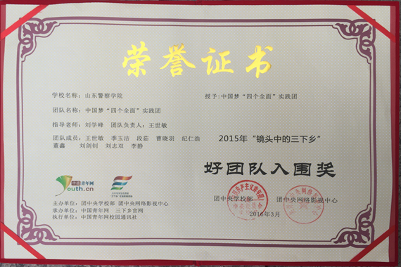 6月17日,由共青团中央学校部、中国青年网联合举办的2015年“镜头中的三下乡”表彰大会在中国农业大学东校区举行。我院“中国梦四个全面实践团”荣获“好团队入围奖”,团队指导教师刘学峰荣获“优秀指导教师”奖。