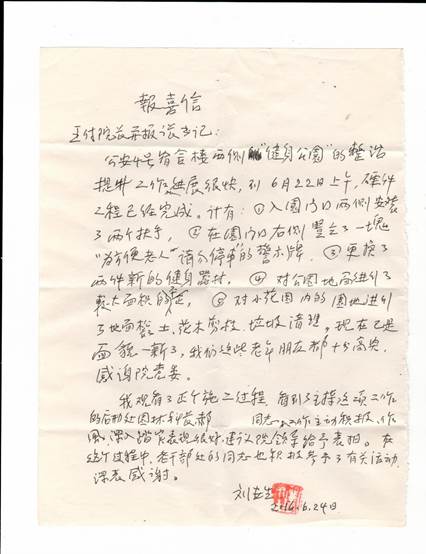6月29日,在学院党委领导看望老党员之际,原副校长刘安生同志亲手将一封《报喜信》递交张俊海书记,对学院党委对文东校区4号宿舍楼西侧健身公园的整治提升工作表示感谢,对后勤管理处、离退休工作处有关同志的努力深表感谢。原文如下: