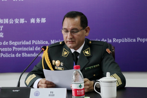 外警学员代表秘鲁内务部国家警察局利马警察局罗杰·佩雷斯·费古埃尔上校发言。他表示,当今世界体现在贩毒、国际恐怖主义、贩卖人口、国际金融诈骗等犯罪的国际化,警察的职能应该使我们与世界上所有的警察团结在一起共同防范和打击各种跨国犯罪。因为,世界警察是一家。最后衷心感谢山东警察学院把我们各国警方联系在了一起。