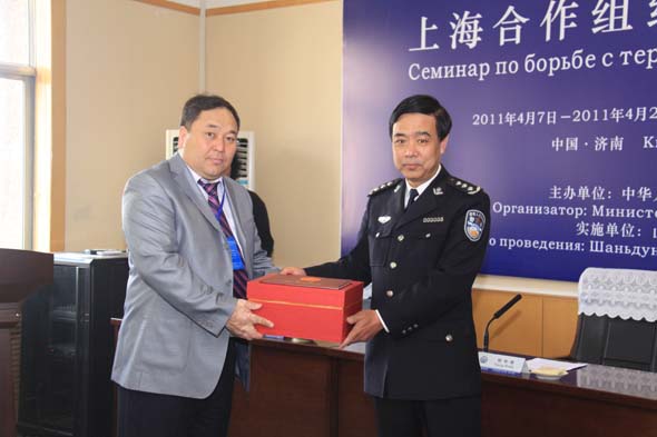 杨和德书记在典礼上讲话。他首先代表商务部、公安部、山东省公安厅、山东警察学院,向研修班学员表示祝贺。他说,在山东警察学院学习期间,我们组织了有关专家学者向大家介绍了中国国情、中国儒家文化、中国反恐法律、反恐情报、反恐对策、爆炸现场处置、网络恐怖主义、中国武术等专题和内容。还参观考察了济南市公安局历下分局、济南市公安局特警支队等中国公安机关实战单位,同时与山东警察学院的专家学者和济南市公安局特警支队进行了座谈交流,此外,我们还组织大家游览了济南的趵突泉、大明湖、百脉泉、植物园等景点。通过这些专题、交流和参观考察活动,使大家对中国的公安机关和公安工作、经济社会发展和中国人文传统等情况有了相对全面的了解。他指出,通过本期研修班的成功举办,必将进一步深化上合组织框架内各成员国警方之间业已存在的良好合作和相互支持,必将进一步增强中国和哈萨克斯坦、吉尔吉斯斯坦、俄罗斯、乌兹别克斯坦警方之间的团结和合作。