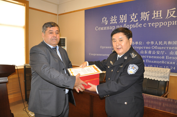 乌兹别克斯坦反恐培训班在我院结业 10月20日上午,乌兹别克斯坦反恐研修班在我院结业。学院党委副书记、副院长王庆功出席结业典礼,学院党委委员、副院长王培韧主持结业典礼。 典礼上,王庆功副书记向培训班学员颁发了结业证书,赠送了纪念品。 王庆功副书记在结业典礼上讲话,对培训班全体学员顺利结业表示热烈祝贺。他说,在校期间,学院组织有关专家学者向各位学员介绍了中国及山东省概况、反恐谈判、网络恐怖主义、中国儒家文化、对恐怖主义的基本认识、中国反恐法律介绍、反恐情报、爆炸现场处置、反恐对策等专题和内容,并与学院的专家学者进行了座谈交流。还组织大家考察了济南市公安局特警支队,游览了山东省博物馆、趵突泉、大明湖等景点。通过这些专题、交流和参观考察活动,各位学员对中国的公安机关和公安工作、经济社会发展等情况都有了相对全面的了解。同时,通过座谈交流活动也使我们对乌兹别克斯坦的有关情况和司法体制有了进一步的了解。王庆功副书记指出,作为警察,维护社会稳定、打击犯罪是我们共同的职责。相信通过本期培训班的成功举办,必将进一步增强两国间的传统友谊和相互信赖,必将进一步促进中国警方和乌兹别克斯坦警方间的相互理解和友好合作。 学员代表、乌兹别克斯坦内务部刑侦及反恐总局处长阿里舍尔·艾尔卡雪夫上校在典礼上发言。他说本期培训班举办的非常成功,学院老师的授课很有经验,非常感谢中国警方和山东警察学院为本次培训班所付出的心血,希望更多的乌兹别克斯坦警方同行能来学院参加培训。艾尔卡雪夫先生祝愿中国警方同乌兹别克警方之间合作愉快,友谊长存。 本期培训班10月12日开学,10月12日至20日在我院学习。从10月20日开始,在我院的组织下,到云南、北京进行考察学习。10月24日结束。共有学员10人。  王庆功副书记在结业典礼上讲话  赠送证书和纪念品  王培韧副院长主持结业典礼  外警代表发言  结业典礼现场 新闻提供:办公室调研科 照片提供:办公室调研科 |