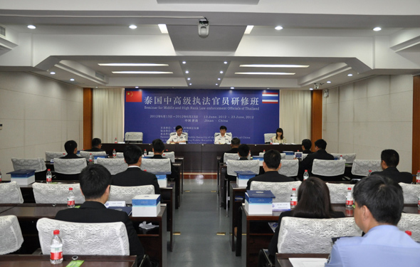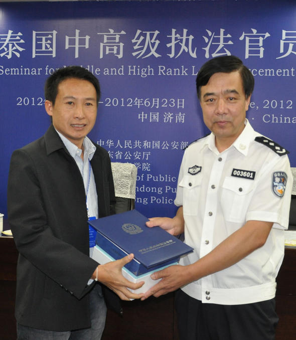 泰国中高级执法官员研修班在我院结业 6月20日下午,泰国中高级执法官员研修班在我院结业。省公安厅党委委员、学院党委书记杨和德,学院党委委员、副院长王培韧出席结业典礼。 结业典礼上,杨和德书记向培训班学员颁发了结业证书,赠送了纪念品。 杨和德书记在典礼上讲话,对培训班顺利结业表示祝贺。他说,在学院期间,我们组织有关专家学者向大家介绍了中国国情、中国儒家文化、中国公安管理体制、紧急警务处置指挥要点、太极拳、中国法律制度、警务指挥体系、信息主导警务等专题和内容。此外,大家还游览了趵突泉、大明湖、山东省博物馆等景点。通过这些专题、交流和参观考察活动,使大家对中国的公安机关和公安工作以及经济社会发展情况有了进一步的了解。泰国同行在研修班举办期间认真的学习态度,严整的纪律作风也给我们留下了深刻的印象。同时,通过交流,我们对泰国的有关情况和司法体制也有了进一步的了解。杨和德书记指出,作为警察,虽然国家制度、社会文化是不同的,但维护社会稳定、打击犯罪是我们共同的职责。相信,通过成功举办本期研修班,必将进一步增强两国间的友谊和相互信赖,必将进一步促进两国警察间的相互理解和友好合作。 学员代表、泰国皇家警察中央调查局反科技犯罪处审讯员素卡森·奥兰在结业典礼上发言,对山东警察学院表示感谢。他希望两国警方间能进一步扩大交流与合作,不断增进双方间友谊,推动中泰传统友好关系取得更大发展。。 王培韧副院长主持结业典礼。 学院办公室、干部培训部负责同志及全体学员参加了结业典礼。 本期培训班6月14日开学,6月14日至20日在我院学习。从6月20日开始,在学院的组织下,培训班学员到北京进行考察学习。6月23日结束。本期培训班共有学员15人。  泰国中高级执法官员研修班在我院结业  杨和德书记在结业典礼上讲话  赠送证书和纪念品  王培韧副院长主持结业典礼  外警代表发言  结业典礼现场 新闻提供:办公室调研科 照片提供:办公室调研科 |