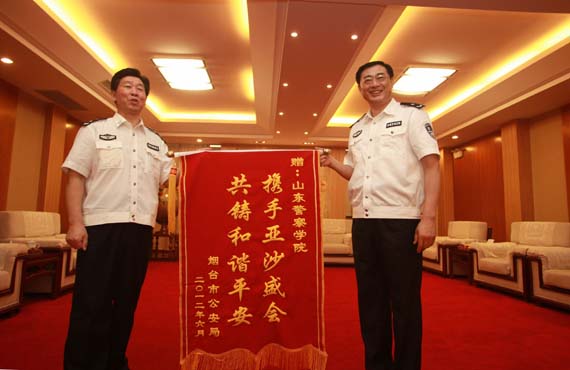雷兴华副局长代表烟台市公安局向学院赠送了“携手亚沙盛会,共铸和谐平安”的锦旗。他说,在学院的大力配合和支持下,烟台公安机关圆满完成了第三届全运会的安保工作,收到了良好的社会反响,得到了上级领导的高度评价。山东警察学院的学生,整体素质高,纪律作风好,在安保工作中,好使好用,认真负责,用着放心,广大师生用实际行动协助烟台市公安机关出色完成了各项安保工作任务,受到各级领导的好评,在此代表烟台市公安局对学院表示衷心感谢。