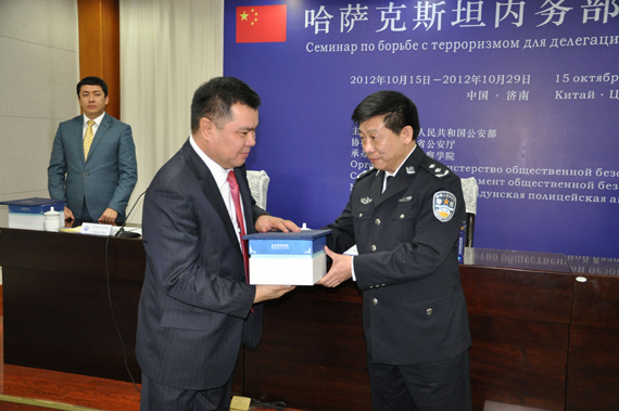 王培韧副院长在典礼上讲话。他说,在山东警察学院学习期间,我们组织有关专家学者向大家介绍了中国国情、反恐情报、太极拳、对恐怖主义的基本认识、中国反恐法律介绍、奥运安保反恐工作综述、爆炸现场处置、反恐对策、金融反恐、网络恐怖主义等专题和内容,并与学院的专家学者们进行了座谈交流。此外,大家还考察了济南市公安局特警支队,游览了济南趵突泉、大明湖、山东省博物馆等景点。通过这些专题、交流和参观考察活动,使大家对中国的公安机关和公安工作以及经济社会发展情况有了初步的了解。王培韧副院长指出,哈萨克学员在培训班举办期间认真的学习态度,严整的纪律作风也给我们留下了深刻的印象,同时,通过座谈交流活动也使我们对哈萨克斯坦的有关情况和司法体制有了进一步的了解。王培韧副院长说,作为警察,维护社会稳定、打击犯罪是我们共同的职责。相信通过成功举办本期培训班,必将进一步增强两国间的友谊和相互信赖,进一步促进两国警察间的相互理解和友好合作。最后,王培韧副院长祝中哈两国间的传统友好关系更加牢不可破,并不断结出硕果。