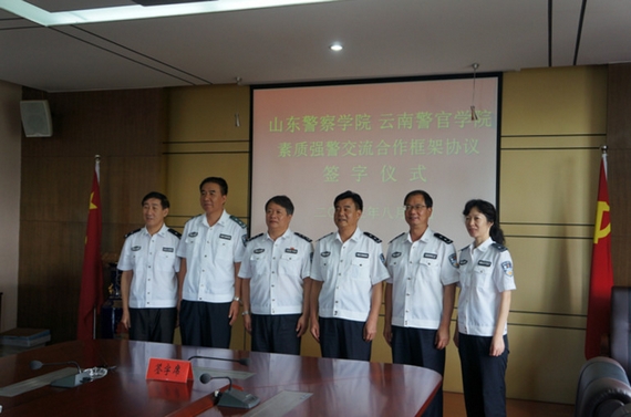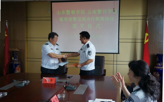 在云南期间,尹长杰书记一行与云南警官学院院长郭宝等进行了座谈交流。座谈会上,郭宝院长介绍了云南警官学院的建设发展状况和纪检监察工作等。受张俊海书记委托,尹长杰代表学院与云南警官学院签署了《素质强警交流合作框架协议》,就两校之间相互考察交流、教育教学交流、民警培训项目交流等进行了磋商,并达成了合作意向。考察期间,尹长杰一行还观摩了公安部在云南警官学院举办的“首届全国公安院校培训基地师生文艺大赛”活动。