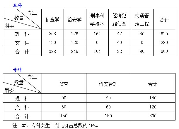 山东警察学院2014年招生简章 学校简介 山东警察学院是一所具有光荣革命传统的学校,其前身是山东省警官学校,1946年创建于山东省临沂。学院目前主要承担两项任务:一是培养全日制公安本、专科大学生;二是承担山东省、全国和国外警察的培训任务,是公安部确定的全国县市公安局长两个培训基地之一,公安部、商务部确定的国家援外培训基地之一,从2006年开始,承担国外警察的培训任务。 60多年来,学院始终坚持政治建警、政治建校,坚持主动服从服务于警务实战需要,培养应用型人才;坚持从严治警、从严治校,为各级公安机关培养输送了5万余名合格人才,为“平安山东”建设、构建和谐社会、促进经济发展做出了积极的贡献。学院已成为培养公安高级专门人才的学府、在职警官培训基地和公安科技研究中心。 学院拥有一支年龄结构、知识结构、公安专业结构、职称结构较为合理,能够适应公安高等教育教学需要的专任教师队伍。开设侦查学、治安学、刑事科学技术、经济犯罪侦查和交通管理工程等五个本科专业和侦查、治安管理两个专科专业。学院建有警用武器、痕检、文检、法医、刑事化验、数字影像、现场模拟、防爆排爆、测谎、模拟派出所等37个实验室。建有2个独立的校园局域网,分别与“中国教育科研网”、“公安专网”联通。拥有2个图书馆,建有现代电子图书系统。定期出版全国优秀社科学报——《山东警察学院学报》。 学院积极开展对外交流活动,多次组团出访并接待了多国警察机关或警察院校的访问。此外,还与香港、澳门警方和省内外公安实战部门建立了良好的学术交流和科研协作关系。受公安部、商务部委托,自2006年起,先后举办了64期国外警察培训班,来自俄罗斯、哈萨克斯坦、朝鲜、土耳其、南非等75个国家的高级警官在我院接受了培训,促进了我院与国外警察同行之间的友谊与合作。 学院以“忠诚、严谨、团结、奉献”为校训,坚持主动服从服务于公安队伍建设和公安工作实际需要的指导思想,抓住机遇,开拓创新,继续加强师资队伍建设,改善办学条件,为建设“平安山东”、“和谐山东”培养更多更好的公安专业人才而奋斗! 培养目标 山东警察学院立足于公安工作实际需要,培养政治坚定、业务精通、作风优良、执法公正的应用型专业人才。 招生计划 2014年,我院计划招收学生1200名,其中本科900名、专科300名。各专业招生计划如下表:  招生对象 1.高级中等教育学校毕业或具有同等学力人员。 2.山东省内户口,年龄不超过22周岁(1992年9月1日后出生),未婚。 招生条件 1.政治条件 凡报考我院的考生,除按照教育部《普通高等学校招生工作规定》中规定的思想政治品德考核标准进行考核外,还必须经过公安机关的政治审查。要求考生本人政治进步、品德优良、作风正派,有较强的组织纪律性和法制观念。 考生有下列情形之一的,为政审不合格: (1)曾受过刑事处罚、劳动教养、少年管教,或者近五年曾受过治安处罚的; (2)有违法犯罪嫌疑正在被政法机关侦查、控制的; (3)曾受过开除学籍、团籍或者党籍纪律处分,或者近三年曾受过记过以上纪律处分的; (4)曾参加过“法轮功”等邪教和其他非法组织,或者带有黑社会性质组织的; (5)有过吸毒史的; (6)直系亲属和关系密切的旁系亲属中有被判处死刑或者因危害国家安全罪被判刑,或者因其他犯罪正在服刑的; (7)直系亲属和关系密切的旁系亲属中有正在被政法机关侦查、控制的犯罪嫌疑人,或者有“法轮功”等邪教和其他非法组织的骨干分子或顽固不化、继续坚持错误立场的。 (8)其他不宜录取的情形。 2.身体条件 报考我院的考生,除按《普通高等学校招生体检工作指导意见》执行外,根据公安部和教育部联合下发的《关于印发<公安普通高等学校招生工作暂行办法>的通知》(公政治〔2000〕137号),考生还应具备下列条件: (1)身高体重 男生身高不低于1.70米,体重不低于50公斤;女生身高不低于1.60米,体重不低于45公斤;身体匀称。 过于肥胖或消瘦者,按体检不合格论。 实际体重超过标准体重25%以上者为过于肥胖; 实际体重低于标准体重15%以上者为过于瘦弱。 标准体重(千克)=身高(厘米)-110 (2)视力、色觉 双眼裸视力均不低于4.8,无色盲、色弱。 (3)身体状况 五官端正,面部无明显特征和缺陷(如唇裂、对眼、斜眼、斜颈、各种疤麻等);两耳无重听,无口吃,嗅觉不迟钝;无鸡胸、无腋臭,无严重静脉曲张;无明显八字步、罗圈腿,无重度平跖足(平脚板);无纹身、少白头、驼背,无各种残疾,直系血亲无精神病史。无传染病。 3.体能条件 凡报考我院的考生,必须参加体能测试,成绩合格。 体能测试项目及合格标准:  专业介绍 本科专业 侦查学 本专业培养具有坚定正确的政治方向、严明的组织纪律观念、良好的职业素养和人文素养,熟悉我国公安工作的路线、方针、政策和相关法律、法规,系统掌握侦查学的基本理论、基础知识和基本技能,具有较强的实战能力和创新精神,能够在公安机关及相关部门从事侦查相关业务工作的应用型高级专门人才。 本专业文理兼收,学制4年,授予法学学士学位。 主要课程有:侦查学总论、犯罪学、侦查程序、犯罪现场勘查学、侦查措施、刑事案件侦查、侦查讯问学、国内安全保卫、刑事科学技术等。 治安学 本专业培养具有坚定正确的政治方向、严明