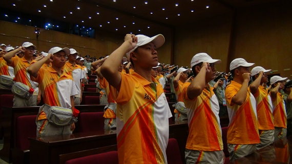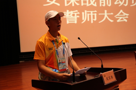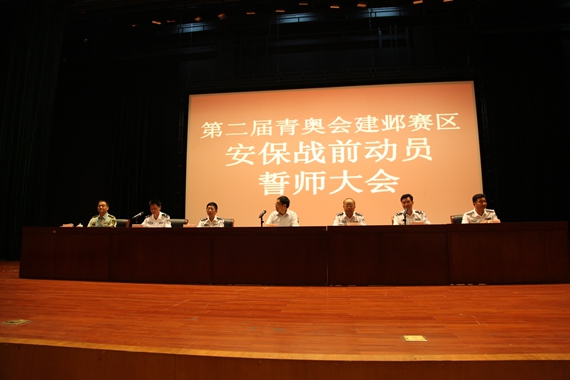 最后全体与会的参战官兵、民警、学警代表做出庄严宣誓,表示在青奥安保工作中,牢记使命,恪尽职守,服从命令,听从指挥,严守纪律,文明执勤,规范执法,热情服务,不怕吃苦,甘于奉献,攻坚克难,决战决胜,以最优良的工作作风,最饱满的精神面貌,誓夺青奥安保金牌。
