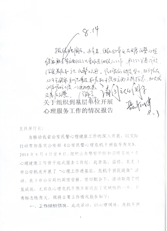 8月14日,省长助理、省公安厅厅长徐珠宝和厅党委委员、政治部主任闫希军在专业基础教研部和省厅组教处共同拟写的《关于组织到基层单位开展心理服务工作的情况报告》中作出了批示,要求要继续努力,在心理健康知识普及和危机干预等方面不断探索,加大培训和管理力度,以更好地惠及基层民警。
