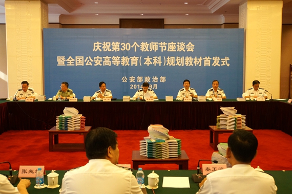 9日下午,公安部在北京举行庆祝教师节座谈会暨公安高等教育(本科)规划教材首发式。公安部党委委员、政治部主任出席会议并讲话。10日上午,国务委员、公安部党委书记、部长郭声琨与在京的部党委成员接见了与会代表,发表重要讲话并与大家合影留念。郭声琨部长强调,公安教育工作寄托着公安事业的希望,承载公安事业的未来。要认真学习贯彻习近平总书记在北京师范大学考察时的重要讲话和对公安工作的重要指示精神,进一步创新教育理念、明确办学思路,准确把握现代教育发展趋势,主动服务公安实战需求,充分发挥学科、人才和科研优势,积极探索建立具有中国特色、符合警察特点的公安高等教育新模式,真正把公安院校建设成为公安专门人才培养阵地和公安理论科研创新高地。
