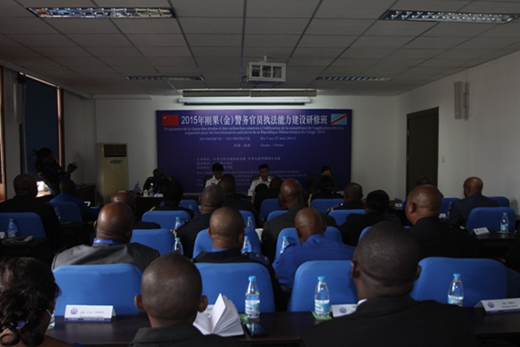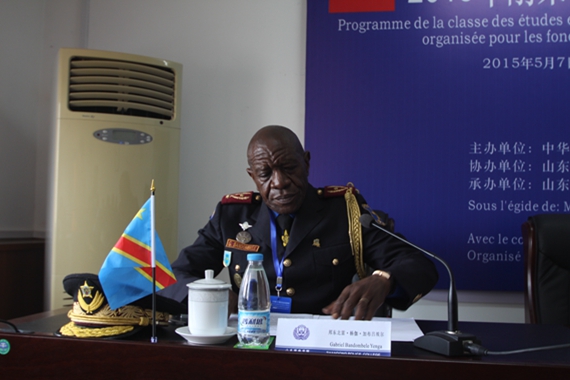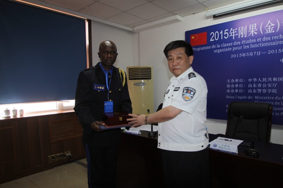 王培韧副院长在结业典礼上讲话。他说,本期研修班经过两个多星期的努力,在山东警察学院的课程已经圆满结束。在此期间,学院为大家开设了中国及山东省概况、中国传统文化、中国公安管理体制、中国法律制度、信息主导警务、紧急警务处置指挥要点、中国公安机关执法规范化建设、中国治安防控体系、中国武术等课程,邀请公安部和山东省公安厅的官员为大家授课,安排大家与山东警察学院的专家学者进行座谈交流。并组织大家赴威海市公安局考察,游览济南的趵突泉、大明湖、山东省博物馆等景点。通过这些专题、交流和参观考察活动,使大家对中国的公安机关和公安工作、中国的经济社会发展情况有了相对全面的了解。各位同行在研修班举办期间认真的学习态度,严整的纪律作风也给我们留下了深刻的印象。也使我们对刚果(金)的有关情况和司法体制有了更深一层的了解。十多天的学习时间虽然不长,但我们已经成为朋友并结下了深厚的友谊。相信通过成功举办本期研修班,必将进一步增强两国间的友谊和相互信赖,必将进一步促进两国警方的相互理解与友好合作。