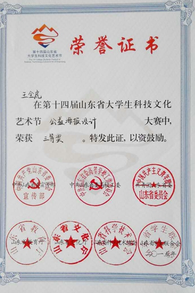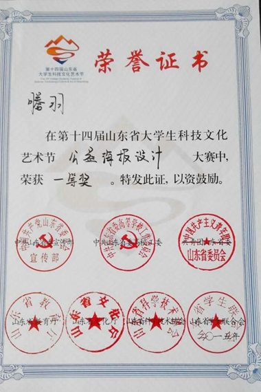 近日,我院2名同学在第十四届山东省大学生科技文化艺术节公益海报设计大赛中获得优异成绩,其中1人获得一等奖,1人获得三等奖。