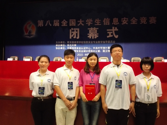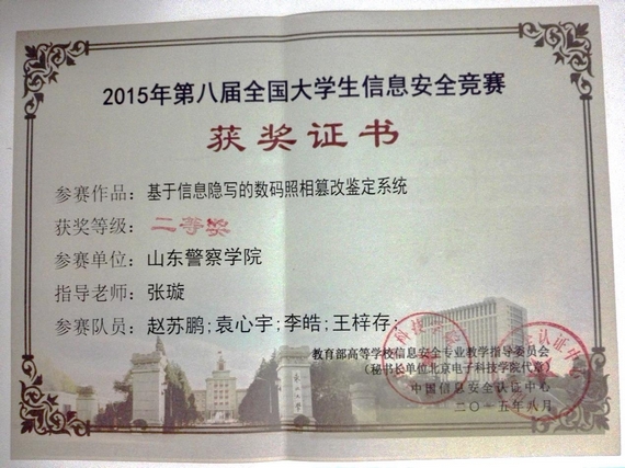2015年8月1日至3日,第八届全国大学生信息安全竞赛在东北大学举行。我院首次派出由指导教师张璇和学生赵苏鹏、李皓、王梓存、袁心宇组成的代表队参加本次赛事,经激烈角逐,我院代表队参赛作品《基于信息隐写的数码照相篡改鉴定系统》获得全国二等奖。