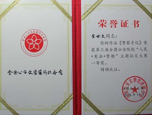 本次征文大赛由全国公安文联、人民公安报社和中国人民公安出版社联合主办,历时半年,我院师生踊跃参加,共有200余人投稿,经过组织评选,推选20篇参加全国比赛。其中公共基础部教师崔世文获一等奖,治安系学生周建明获二等奖,王奕飞、娄焕娟等同学获三等奖。