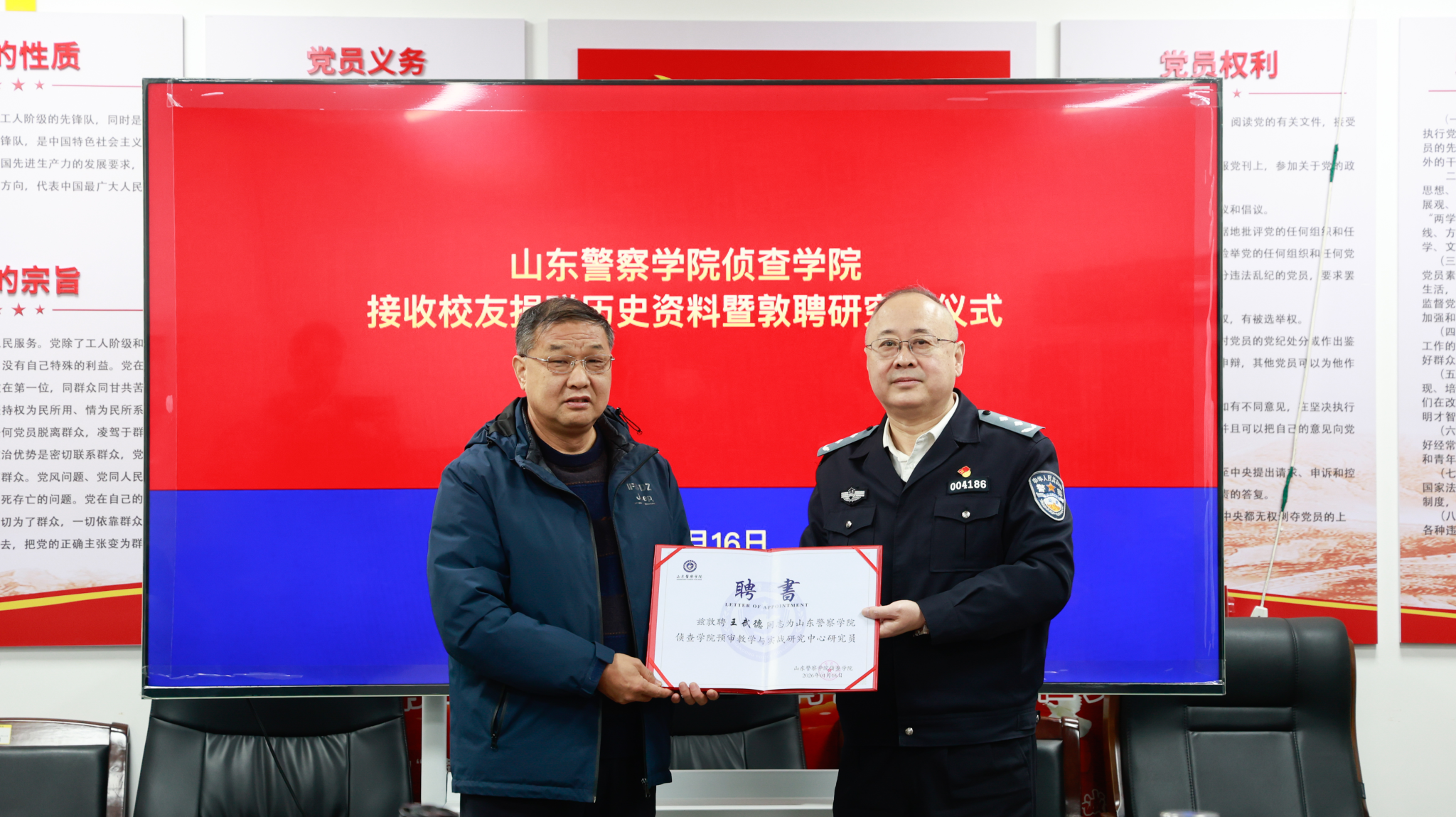 讲座开始前,王桂媛代表学校接收王武德捐赠的历史资料。侦查学院党政主要负责同志为王武德颁发了山东警察学院侦查学院特聘研究员聘书。