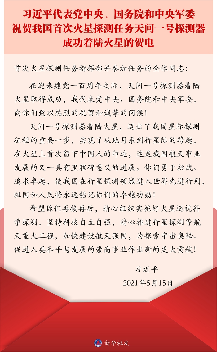 新华社北京5月15日电 中共中央总书记、国家主席、中央军委主席习近平代表党中央、国务院和中央军委致电祝贺我国首次火星探测任务天问一号探测器成功着陆火星。贺电全文如下: