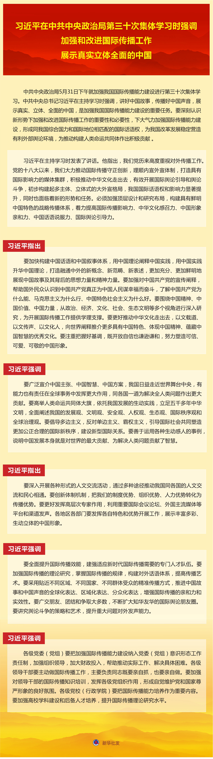习近平强调,要全面提升国际传播效能,建强适应新时代国际传播需要的专门人才队伍。要加强国际传播的理论研究,掌握国际传播的规律,构建对外话语体系,提高传播艺术。要采用贴近不同区域、不同国家、不同群体受众的精准传播方式,推进中国故事和中国声音的全球化表达、区域化表达、分众化表达,增强国际传播的亲和力和实效性。要广交朋友、团结和争取大多数,不断扩大知华友华的国际舆论朋友圈。要讲究舆论斗争的策略和艺术,提升重大问题对外发声能力。