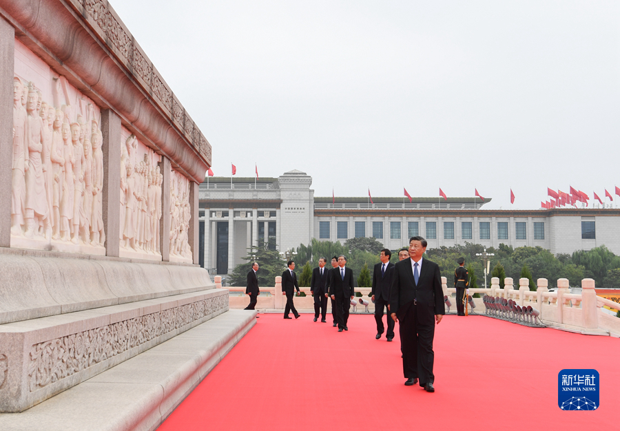 习近平迈步向前,仔细整理花篮缎带。接着,习近平等党和国家领导人缓步绕行,瞻仰人民英雄纪念碑。