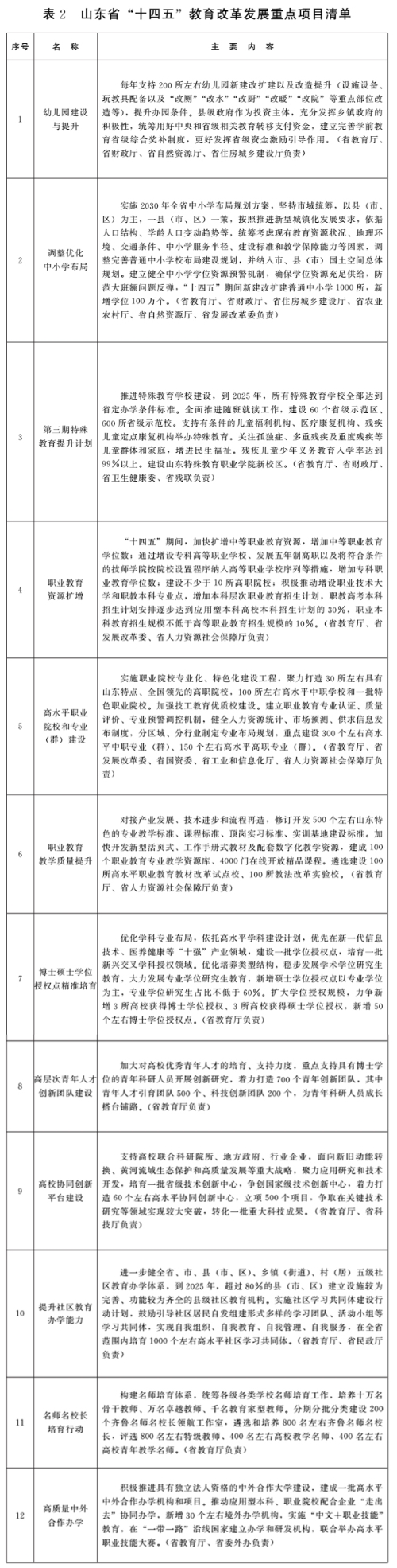 服务国家战略和山东经济社会发展能力显著提升。建成全国职业教育创新发展新模式、高等教育改革发展新样态,有效支撑山东半岛城市群在黄河流域生态保护和高质量发展中发挥龙头作用。省市一体化推进济南新旧动能转换起步区教育改革发展。“一带一路”教育合作全面推进,打造形成教育对外开放的桥头堡。建成一批高层次科技创新平台,形成一批具有重大影响力的创新成果,建立较为完善的科技成果转移转化机制。人才培养规模和质量契合“十强”现代优势产业集群发展需要。