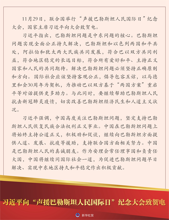 新华社北京11月30日电 11月29日,联合国举行“声援巴勒斯坦人民国际日”纪念大会,国家主席习近平向大会致贺电。