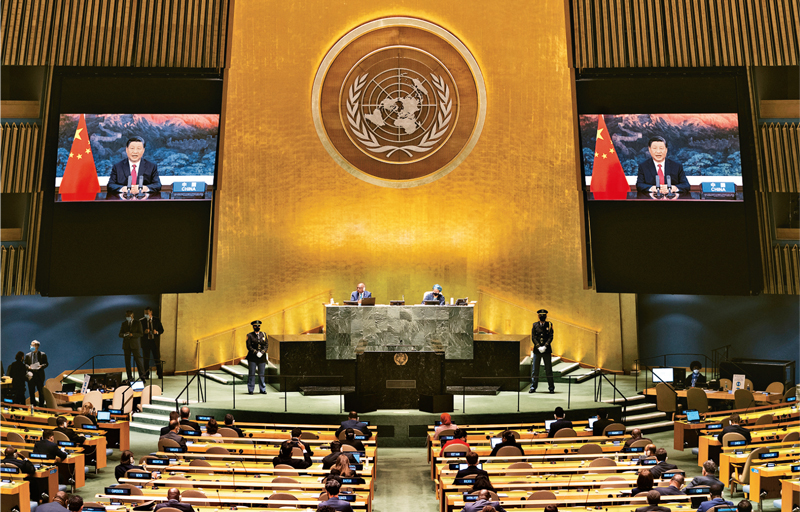 2021年9月21日,国家主席习近平在北京以视频方式出席第七十六届联合国大会一般性辩论并发表题为《坚定信心 共克时艰 共建更加美好的世界》的重要讲话。这是大会现场。 新华社记者 王迎/摄