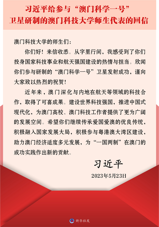 新华社北京5月24日电 国家主席习近平5月23日给参与“澳门科学一号”卫星研制的澳门科技大学师生代表回信,对他们予以亲切勉励。