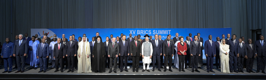 当地时间8月24日上午,国家主席习近平在约翰内斯堡出席金砖国家同非洲国家及其他新兴市场和发展中国家领导人对话会。会议由南非总统拉马福萨主持,巴西总统卢拉、印度总理莫迪、俄罗斯总统普京(线上)和60多位非洲国家及其他新兴市场和发展中国家领导人或代表,以及联合国秘书长古特雷斯、新开发银行行长罗塞夫等国际和地区组织负责人出席。这是与会领导人集体合影。新华社记者 李学仁 摄