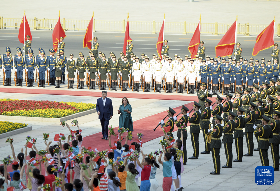 6月28日下午,国家主席习近平在北京人民大会堂同来华进行国事访问的秘鲁总统博鲁阿尔特举行会谈。这是会谈前,习近平在人民大会堂东门外广场为博鲁阿尔特举行欢迎仪式。新华社记者 高洁 摄